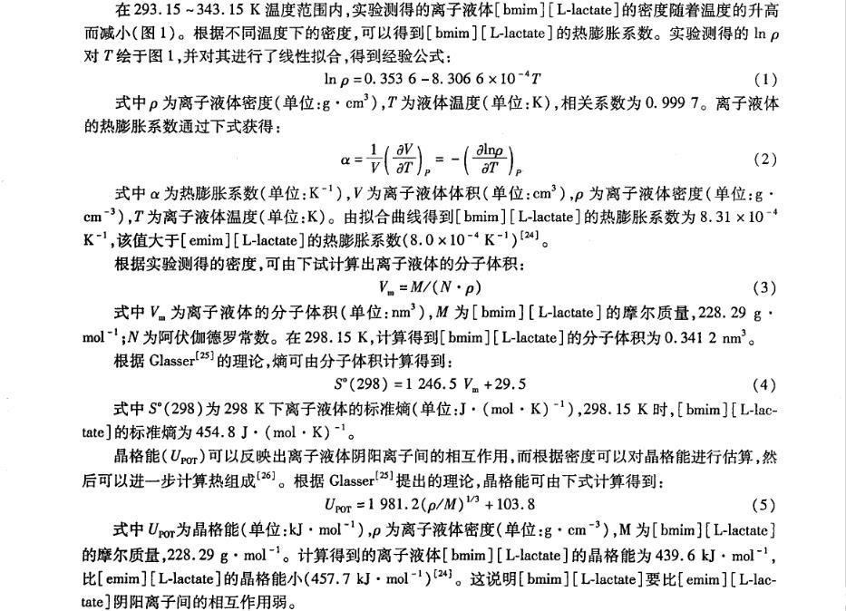 離子液體物理化學性質(zhì)的研究對離子液體的設(shè)計和應(yīng)用具有重要的指導(dǎo)作用,而對于離子液體與分子溶劑(例如水)的混合物性質(zhì)研究將會揭示該類液體的新的應(yīng)用。筆者在不同溫度下測定帶有手性陰離子的純離子液體1-丁基-3-甲基-咪唑乳酸鹽([bmim][L-lactate])及[bmim][L-lactate]+H2O二元混合物的密度和表面張力,并對其體積性質(zhì)和表面性質(zhì)進行研究。以期進一步豐富手性離子液體與分子溶劑二元混合物的物理化學性質(zhì)數(shù)據(jù),為其應(yīng)用提供更多的理論依據(jù)。