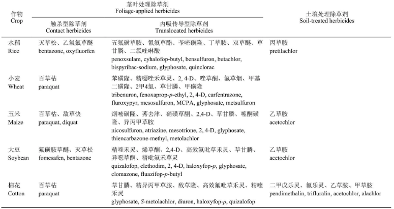 表1 五大作物田中用量最大的前10 種除草劑