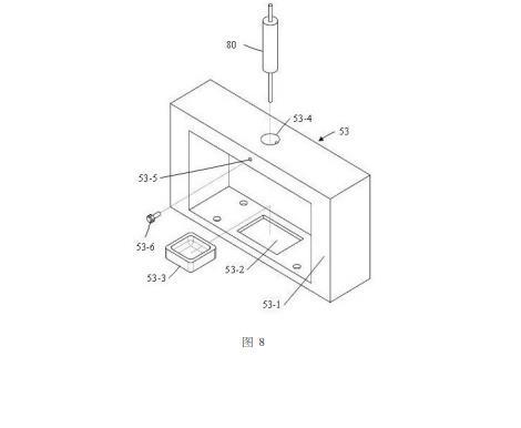 如圖8所示,第三窗形件53的第三邊框部53-1的下邊框上設(shè)置有一個例如長方形的凹坑53-2,并且沿左右方向凹坑53-2位于第三邊框部53-1的中間位置,凹坑53-2內(nèi)設(shè)置有一個積液盆53-3。第三窗形件53的第三邊框部53-1的上邊框上設(shè)置有一個例如圓形的第三通孔53-4,第三通孔53-4沿豎直方向延伸,并且第三通孔53-4位于凹坑53-2的正上方;注射器80包括主體管80-1和固定設(shè)置于主體管80-1下端面的針管80-2,主體管80-1和針管80-2均為內(nèi)部中空的圓形管,并且針管80-2的直徑小于主體管80-1的直徑,針管80-2與主體管80-1的內(nèi)部空腔相連通;注射器80的主體管80-1固定設(shè)置于第三通孔53-4內(nèi),并且針管80-2的末端剛好與攝像機(jī)61的中心軸線(即光源62的中心軸線)相交。在本實施例中,第三窗形件53的第三邊框部53-1的上邊框的側(cè)面設(shè)置有一個沿前后方向延伸的第一螺紋孔53-5,并且第一螺紋孔53-5與第三通孔53-4相連通;螺栓53-6設(shè)置于第一螺紋孔53-5內(nèi),螺栓53-6的外螺紋能夠與第一螺紋孔53-5相嚙合,并且螺栓53-6的里端能夠與注射器80的主體管80-1外壁相抵接,從而使得注射器80的主體管80-1固定設(shè)置于第三通孔53-4內(nèi)。