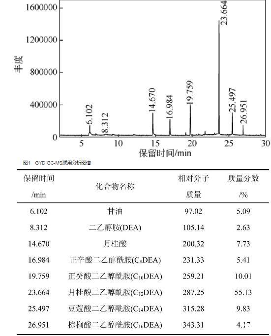 取一定量的GYD,用甲醇作溶劑,將其稀釋至約0.4%的質量分數后,進行GC-MS全掃描分析,得總離子流色譜圖見圖1。用氣相色譜數據處理系統(tǒng),以峰面積歸一法測得其中各組分的相對質量分數,分析結果見表2。從表2可以看出,GYD是一種組成復雜的烷基醇酰胺混合物,主要包括不同碳數脂肪酸二乙醇酰胺和剩余原料甘油、二乙醇胺、月桂酸等。其中,月桂酸二乙醇酰胺相對含量最高為55.13%。