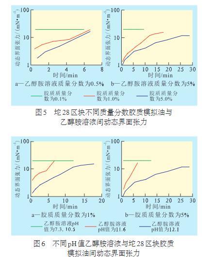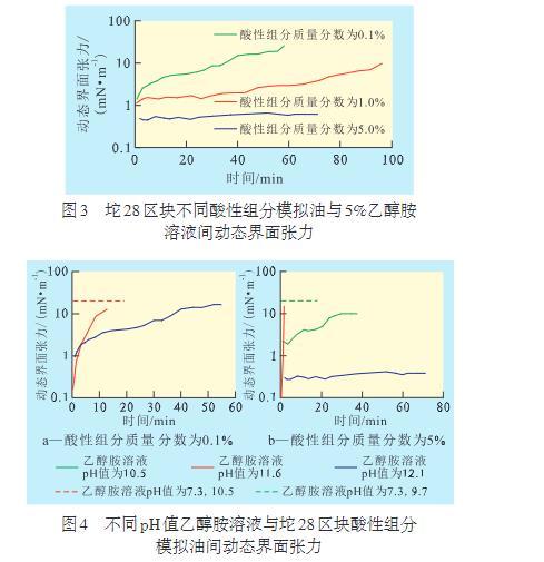 ZhangL等曾對勝利油區(qū)孤東油田外輸油中的酸性組分按相對分子質(zhì)量和極性細分,研究發(fā)現(xiàn):對于相對分子質(zhì)量較低的脂肪酸,弱堿條件下就能夠發(fā)生反應,大幅度降低界面張力瞬時值,但穩(wěn)態(tài)值較高,動態(tài)界面張力曲線呈“V”型,油酸模擬油的動態(tài)界面張力特性就是典型代表;而對于相對分子質(zhì)量較高、含稠環(huán)的芳香酸,則只能與強堿發(fā)生反應,生成的芳香酸皂水溶性較弱,傾向于吸附在界面上,因此,動態(tài)界面張力不再出現(xiàn)極小值。坨28區(qū)塊原油的酸性組分是混合酸,其中不同結(jié)構(gòu)的石油酸可能在不同pH值條件下分別起主導作用:低質(zhì)量分數(shù)的乙醇胺溶液主要與低相對分子質(zhì)量的脂肪酸作用,而高質(zhì)量分數(shù)的乙醇胺溶液主要與高相對分子質(zhì)量的芳香酸作用。