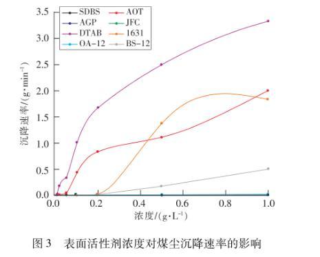 由表4和圖3可以看到,當(dāng)濃度為0.1 g/L時,煤塵在AOT和APG溶液中的沉降時間不到1 min,而在陽離子和兩性型表面活性劑溶液中的沉降時間超過1 h。在同一濃度下,煤塵在不同表面活性劑溶液中的沉降時間相差較大,表面活性劑自身性質(zhì)影響潤濕煤塵的作用。當(dāng)濃度增大到各表面活性劑的臨界膠束濃度附近時,煤塵在陰離子和非離子表面活性劑中的沉降時間會急劇下降,縮短至5 min之內(nèi),但在陽離子和兩性型表面活性劑中沉降時間依然大于1 h。總體而言,8種表面活性劑潤濕煤塵的能力由強(qiáng)到弱依次排序為:APG>AOT>JFC>SDBS>OA-12>BS-12>1631>CTAB,這與表面活性劑降低表面張力的能力排序基本一致。陽離子表面活性劑潤濕煤塵效果最差,主要是因為親水頭基的正電荷與煤塵所帶負(fù)電荷之間的靜電力大于疏水基團(tuán)之間的范德華力,形成了親水基團(tuán)朝向煤塵表面、疏水基團(tuán)朝向水的單分子膜,不利于潤濕。APG潤濕煤塵效果最好主要與其自身結(jié)構(gòu)有關(guān),APG分子結(jié)構(gòu)碳原子上的醇羥基與水分子之間存在強(qiáng)烈相互作用,間接弱化了烷基糖苷分子結(jié)構(gòu)中親水基團(tuán)與煙煤表面含氧親水官能團(tuán)之間的吸附作用,更有利于疏水基團(tuán)與煤塵表面的疏水基團(tuán)發(fā)生強(qiáng)烈相互作用,以親水頭基伸向溶液,疏水尾部吸附在煤塵上的方式排列,降低了溶液及固-液界面張力,增加了煤塵親水性。APG濃度達(dá)到0.02 g/L時,煤塵沉降時間僅為057 min,沉降速率為0.18 g/min,潤濕煤塵效果良好,當(dāng)濃度繼續(xù)增大,潤濕煤塵作用變化不大,綜合考慮成本及效率后,選擇濃度為0.02 g/L的APG作為低階煤用噴霧抑塵法的添加劑。