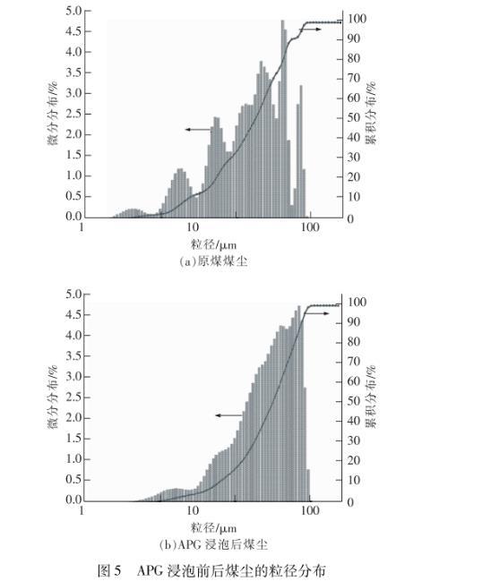 由圖5可見,經(jīng)APG浸泡后煤塵粒徑增大。原煤煤塵的平均粒徑為22.62μm,經(jīng)APG浸泡后增大到3518μm。浸泡前煤塵的粒徑分布不均勻,粒徑眾數(shù)為48.41μm,浸泡后煤塵粒徑的均一性增強(qiáng),呈較典型的正態(tài)分布,粒徑眾數(shù)也增大至76.51μm。這說明煤塵表面親水官能團(tuán)的增加和分子間締合氫鍵的形成,促使煤塵之間發(fā)生了團(tuán)聚作用,使原本無法發(fā)生重力沉降的“小粒徑”煤塵變成了能夠發(fā)生重力沉降的“大粒徑”顆粒,加快了沉降速率,縮短了沉降時間,與煤塵沉降實驗結(jié)果一致。