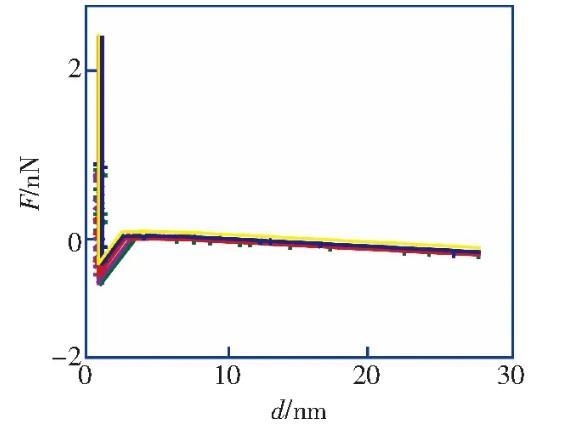 筆者利用原子力顯微鏡實驗測量了HOPG表面在醇-水替換前后的力距離曲線,發(fā)現(xiàn)醇-水替換前進(jìn)針曲線的跳進(jìn)距離小于5 nm,滿足DLVO理論;而在醇-水替換后納米氣泡覆蓋率為21.8%的情況下,進(jìn)針曲線的跳進(jìn)距離均大于10 nm,不能再用DLVO理論解釋,證明了IGE與納米氣泡共存這一現(xiàn)象。根據(jù)改進(jìn)的Laplace-Young方程,結(jié)合文獻(xiàn)中對納米氣泡線張力值的計算結(jié)果,分析負(fù)的線張力對過渡區(qū)內(nèi)局部表面張力及局部固-液界面的影響,導(dǎo)致納米氣泡的接觸角反常小的原因之一。分析并討論雜質(zhì)對納米氣泡接觸角的影響,指出IGE與納米氣泡共存、線張力及雜質(zhì)影響的共同作用是導(dǎo)致納米氣泡接觸角“反常小”的原因。