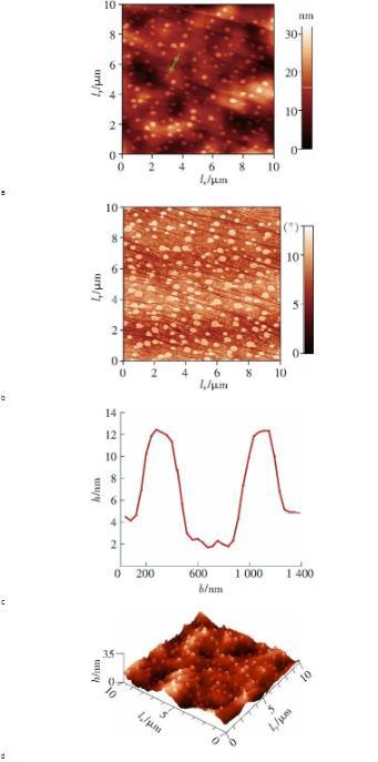 圖2a是探針在超純水中HOPG表面測得的力-位移曲線,當(dāng)分離距離大于5 nm時,針尖和表面之間的作用力主要為斥力。由于實驗中的水呈弱酸性(PH約5.6),而研究表明,HOPG表面在弱酸性水中帶弱負(fù)電荷,探針針尖(單晶硅)在水中也認(rèn)為是帶弱負(fù)電荷。因此,這個斥力可以解釋為雙電層(Electrostatic double layer,EDL)引起的。當(dāng)分離距離小于5 nm時,在范德華力的作用下,針尖產(chǎn)生‘跳進(jìn)’(jump in)現(xiàn)象并與HOPG表面接觸,整個力曲線符合DLVO理論。醇-水替換之后,在10 10掃描區(qū)域內(nèi)采用Taping-Mode模式(95%的set-point)以1 Hz的掃描頻率,如圖3a所示,HOPG表面上生成的納米氣泡呈球冠狀,相應(yīng)的三維圖如圖3d所示。
