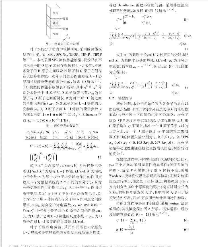 水是許多化學(xué)反應(yīng)過程廉價的反應(yīng)溶劑,也是化工生產(chǎn)過程常用的工質(zhì)。汽液界面行為是研究水相變傳熱問題的基礎(chǔ)。目前,工程上許多有關(guān)水蒸發(fā)、水蒸氣冷凝、加熱干燥等相變傳熱數(shù)據(jù)仍主要依賴于實驗。隨著分子模擬技術(shù)的發(fā)展,采用分子動力學(xué)模擬方法,從分子水平揭示水汽液界面特性的研究,引起了國內(nèi)外許多學(xué)者的極大關(guān)注。本文擬采用SPC模型,對水汽液界面特性進行平衡分子動力學(xué)模擬研究,探討溫度、截斷半徑、模擬分子數(shù)對水汽液界面特性的影響規(guī)律。