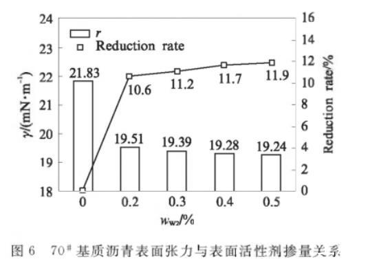 使用改進差分毛細管法,得到不同表面活性劑摻量wW2下B+W2的表面張力值,見圖6.由圖6可見:未摻表面活性劑時,70#基質(zhì)瀝青表面張力為21.83mN/m,表面活性劑摻量為0.2%時B+W2的表面張力為19.51mN/m,表面張力顯著降低,降幅為10.6%;表面活性劑摻量在0.3%——0.5%,表面張力在19.24——19.39mN/m,與70#基質(zhì)瀝青相比,表面張力降幅趨緩,降低幅度為11.2%——11.9%.