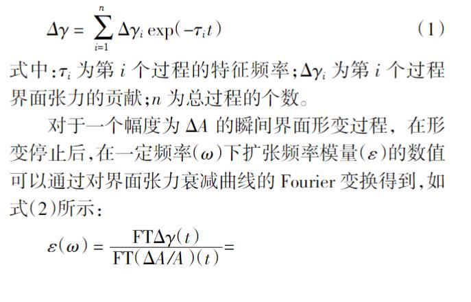 對(duì)于一個(gè)幅度為ΔA的瞬間界面形變過程,在形變停止后,在一定頻率(ω)下擴(kuò)張頻率模量(ε)的數(shù)值可以通過對(duì)界面張力衰減曲線的Fourier變換得到,如式(2)所示: