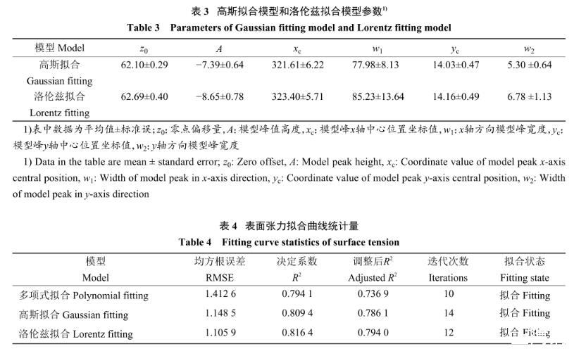 多項式擬合模型的參數(平均值±標準誤)如下所示:z0=116.16±43.94,A1=?0.23±0.10,A2=0.002±0.001,A3=(?1.19±0.45)×10?5,A4=(2.25±0.88)×10?8,A5=(?1.91±0.64)×10?11,B1=?19.950 0±19.724 9,B2=3.22±3.21,B3=?0.24±0.24,B4=0.009±0.008,B5=(?1.22±1.30)×10?4。表3為高斯擬合模型和洛倫茲擬合模型參數,表4為溶液表面張力3種擬合曲線的統計量。由表4可以看出,3種擬合方式的決定系數(R2)均大于0.79,調整后R2(Adjusted R2)均大于0.73,這說明擬合函數有意義,且均方根誤差(Root mean square error,RMSE)都小于1.5。3種擬合模型均能夠描述磁場強度和磁化時長對除草劑溶液表面張力的影響,但相比較于其他2種擬合方式,洛倫茲擬合R2為0.816 4,調整后R2為0.794 0,兩者均大于其他2種擬合方式,R2與調整后R2越大,說明擬合效果越好;RMSE為1.105 9,均小于其他2種擬合方式,RMSE越小,說明預測模型描述試驗數據越精確。