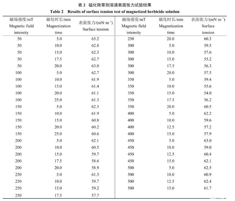 磁場強度和磁化時長對除草劑溶液表面張力、噴霧霧滴粒徑的影響(二)