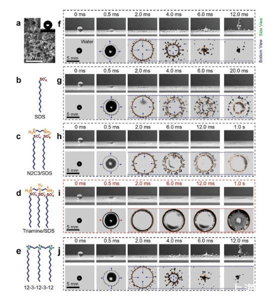 圖1.高速液滴撞擊超疏水表面的動態行為。a)掃描電子顯微鏡(SEM)揭示了表面的微觀結構。插圖:水接觸角為161.3±1.1°,確保超疏水性。b–e)表面活性劑的分子結構。f)撞擊超疏水表面的水滴出現飛濺和反彈。g–j)分別含有SDS、N2C3/SDS、三胺/SDS和12-3-12-3-12添加劑的水滴在超疏水表面上的撞擊動力學的側面和仰視圖。g,h)含有SDS或N2C3/SDS添加劑的液滴抑制了反彈,但仍會產生飛濺或后退破碎。i)含有三胺/SDS的液滴一旦與基材接觸就會形成穩定的周邊邊緣,隨后完全沉積在超疏水表面上而不會發生任何飛濺或碎裂。完全均勻的潤濕膜在達到最大擴散面積后保持不變。j)合成低聚表面活性劑12-3-12-3-12添加劑對水滴的影響影響不大。濺射和反彈仍然會發生。箭頭的長度表示擴散或反彈速度的變化。