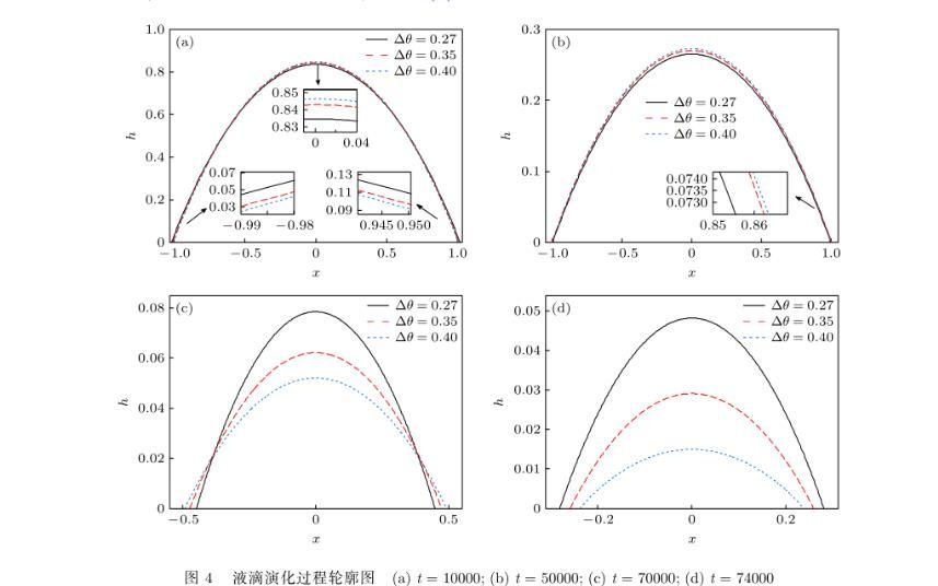 液滴演化過程如圖4所示,由圖4(a)可知,在鋪展階段,隨著遲滯角的增大,液滴鋪展半徑縮小,液滴厚度增大,但因該階段液滴表面溫度較低,蒸發速率較慢,不同遲滯角下的液滴輪廓差異并不顯著.圖4(b)—圖4(d)表明,在去釘扎階段,當遲滯角增大時,液滴收縮速度加快,液滴厚度減小.隨著時間的推移,液滴表面溫度提高,蒸發速率也不同程度地增大,液滴輪廓逐漸顯出差異;由圖4(d)可知,t=74000時,Δθ=0.27,0.35和0.40下的液滴收縮半徑分別為0.2798,0.2579和0.2352,液滴高度分別為0.04825,0.0291和0.01496,即遲滯角越大,液滴收縮半徑和高度都越小.