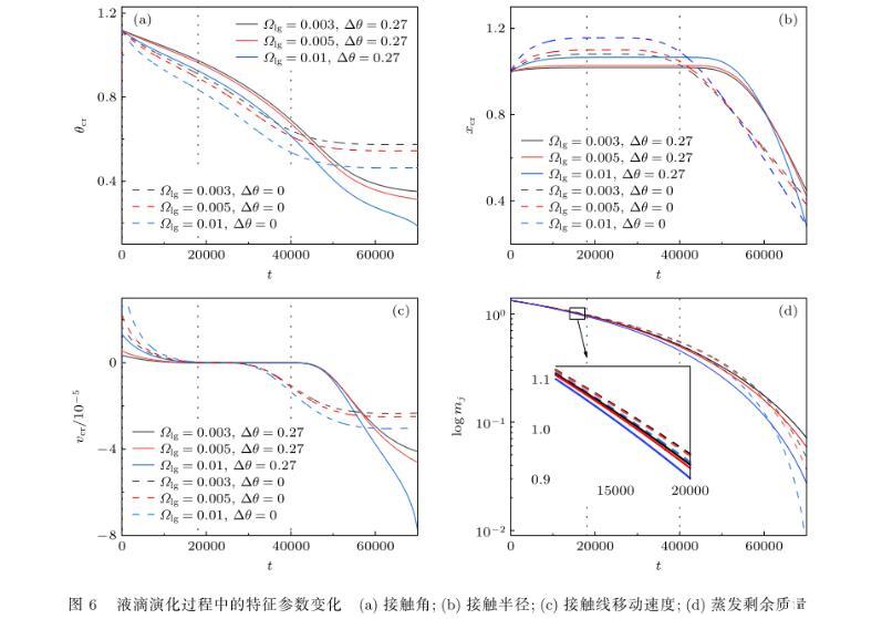 與增加接觸角遲滯不同的是,氣-液界面張力敏感性系數增加后,液滴的平衡接觸角、前進接觸角和后退接觸角均減小,強化了液滴在壁面上的潤濕效果,液滴傳熱也得以加強,液滴蒸發加快.結合液滴蒸發過程的動態特性,通過增加接觸角遲滯或氣-液界面張力對溫度的敏感性將減小后退接觸角,進而加快液滴蒸干進程.