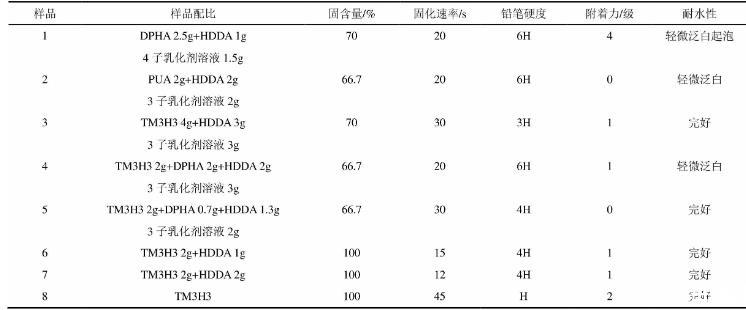 注:所用乳化劑溶液濃度均為0.06mol/L的鈉鹽溶液,以4%的1173引發光固化。