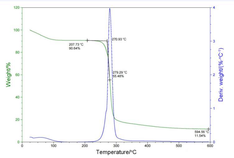 TGA圖中可以看到樣品的失重主要集中在100℃以下和250℃到300℃,DSC圖中可以看出樣品的吸熱主要有三個區域,分別在100℃以下,140——170℃和260——300℃。結合TGA和DCS來看,在溫度100℃以下部分是少量溶劑及產物中的水蒸發,溫度達到140℃時,DSC中有吸熱峰,但TGA曲線沒有變化,說明產物發生相變,從固體轉變為液體,直到250℃左右開始失重,最終仍有11.54%固體剩余證明一定存在分解現象并產生固體產物,結合DSC圖中有多個吸熱峰來看推測是產物有多步分解,也不排除存在部分的汽化失重的可能性。