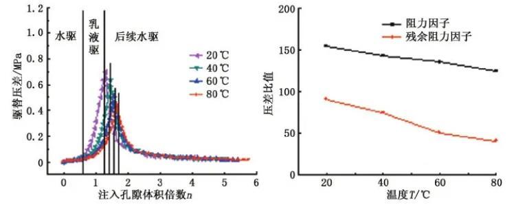 從圖9可以看出,隨著壓力的升高,阻力因子和殘余阻力因子均逐漸增強,說明形成的乳液性質大幅提高,之后隨壓力的升高增幅變小。這是由于隨著壓力的升高,CO2乳液界面黏彈性增加,乳液穩定性增強,乳液的強度及抗沖刷能力提高,且CO2密度也隨著壓力的升高而增大,因此乳液的表觀黏度增加較為明顯,從而提高了乳液的封堵能力。