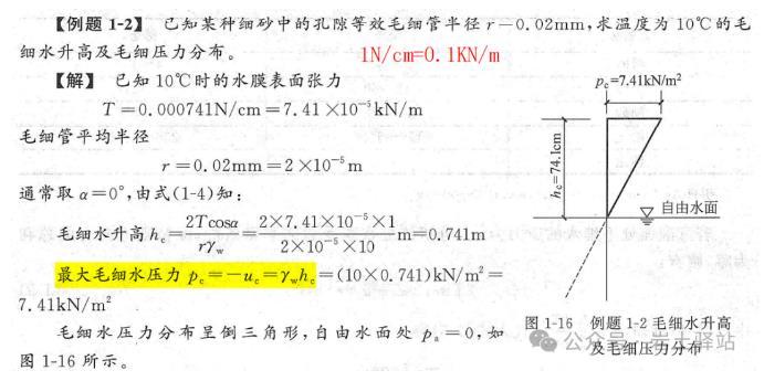 來自《土力學(xué)》式中,水膜張力T與溫度有關(guān),單位:N/cm或KN/m;10°時,T=7.41×10-4N/cm=7.41×10-5KN/m;方向與毛細(xì)管成夾角α,該角度的大小與土顆粒礦物成分和水性質(zhì)有關(guān);
