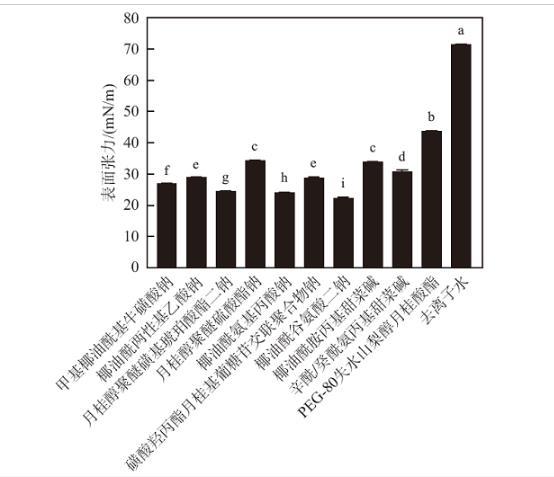 將10種表面活性劑的去離子水溶液(pH=6.0)進行表面張力測定,結果如圖1所示。去離子水的表面張力為71.81 mN/m;所有表面活性劑均可顯著降低去離子水的表面張力,其中PEG-80失水山梨醇月桂酸酯降低表面張力的能力最差,為43.73 mN/m;月桂醇聚醚硫酸酯鈉和椰油酰胺丙基甜菜堿水溶液的表面張力無顯著差異,分別為34.14和33.87 mN/m;辛酰/癸酰氨丙基甜菜堿水溶液的表面張力為30.54 mN/m;椰油酰兩性基乙酸鈉和磺酸羥丙酯月桂基葡糖苷交聯聚合物鈉水溶液的表面張力無顯著差異,分別為28.88和28.71 mN/m;甲基椰油?;;撬徕c水溶液的表面張力為26.74 mN/m;月桂醇聚醚磺基琥珀酸酯二鈉水溶液的表面張力為24.16 mN/m;椰油酰氨基丙酸鈉水溶液的表面張力較低,為23.84 mN/m;椰油酰谷氨酸二鈉水溶液的表面張力最低,為22.08 mN/m。
