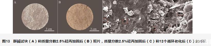 酥堿試塊(圖13A)經(jīng)硅丙乳液修復(fù)后再進(jìn)行濕熱老化12個(gè)循環(huán),肉眼觀察發(fā)現(xiàn)加固后的試塊(圖13B)表面無(wú)酥堿等病害。此外,對(duì)加固后以及12次循環(huán)老化后的試塊進(jìn)行SEM分析。從圖13C可以看出,修復(fù)加固后試塊內(nèi)部能看到明顯的成膜現(xiàn)象,說(shuō)明硅丙乳液滲透加固性較好;而老化12個(gè)循環(huán)后(圖13D),成膜現(xiàn)象仍然存在,進(jìn)一步證明硅丙乳液具有較強(qiáng)的收縮性和耐老化性。因而可以將其作為性能優(yōu)異的膠結(jié)材料用于酥堿壁畫的修復(fù)中。