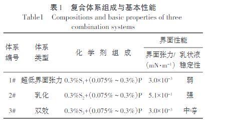 界面張力按照設(shè)定濃度分別配制超低界面張力、乳化和雙效復(fù)合體系(表1),在70°C下利用界面張力儀,測試其與目標(biāo)稠油的界面張力。