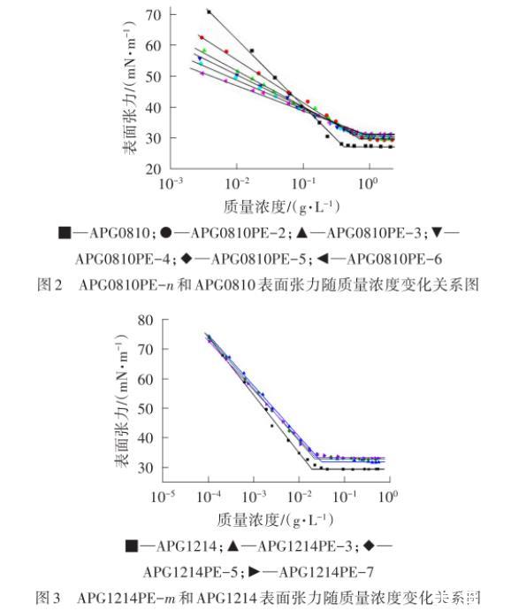 圖2 APG0810PE-n和APG0810表面張力隨質(zhì)量濃度變化關(guān)系圖
