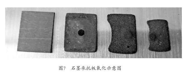 石墨在高溫下易氧化,如圖7所示,氧化會破壞高純石墨承托板的表面平整度,影響玻璃熔體成球形狀,進而影響玻璃液滴體積測量,最終導致表面張力測量誤差。為了避免高純石墨承托板氧化以及玻璃試樣在高溫熔融狀態下氧化的問題,須在試樣放進加熱爐前通入保護氣,因為非極性分子對玻璃熔體表面張力的影響最小,非極性分子有氮氣、氦氣、氫氣等,而氮氣廉價且易得,選用氮氣作保護氣。考慮到爐管直徑與體積,轉子流量計設置為1~3 L/min,大致能夠滿足每分鐘3~10倍的氣體置換,使爐內形成正壓,氧氣不會滲入爐內,防止石墨承托板氧化,保護氣體充滿整個加熱爐的同時不會氣流過大,將試樣吹落。
