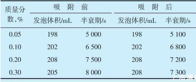 配制質量分數為0.05%,0.10%,0.20%和0.30%的磺基甜菜堿泡沫劑,再分別充入純度為99.9%的氮氣,利用羅氏泡沫儀測試氮氣泡沫體系吸附前后的泡沫性能。評價結果(表1)表明,當溫度為80℃時,不同質量分數的氮氣泡沫體系在吸附前后發泡體積均保持在200 mL左右,半衰期大于5 000 s,表明均具有良好的起泡性能和穩定性能。