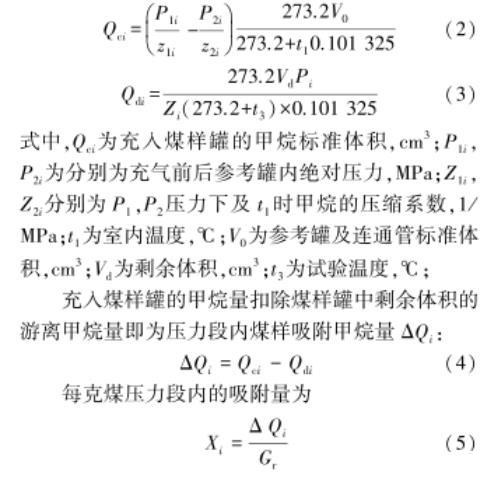 充入煤樣罐的甲烷量扣除煤樣罐中剩余體積的游離甲烷量即為壓力段內煤樣吸附甲烷量ΔQi: