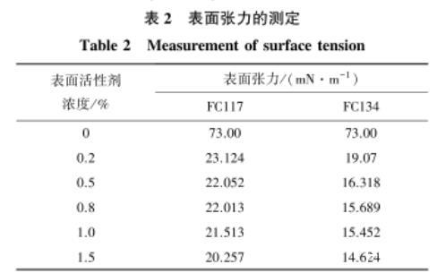 由表2可知,隨著FC117和FC134兩種表面活性劑溶液濃度的增加,溶液的表面張力先迅速降低,再逐漸趨于穩定。當表面活性劑濃度從0增加至0.2%時,表面張力從初始的73 mN/m分別降至23.124 mN/m和19.07 mN/m,表面張力大幅度地降低;當表面活性劑濃度從0.2%增加至1.5%時,表面張力變化幅度較小,保持著較小程度的降低,并趨于穩定。