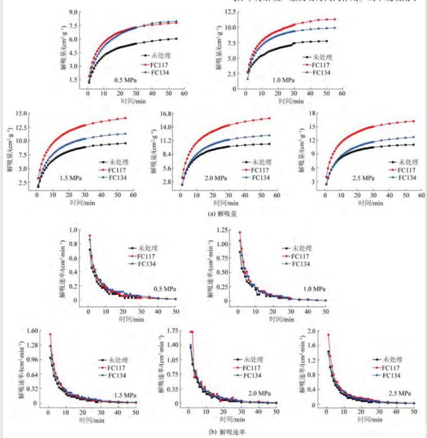 4)對經過FC117和FC134處理后的干燥/含水煤樣進行解吸量和解吸速率的測定,兩種表面活性劑處理后煤樣的解吸效果均有顯著的效果。在氣潤濕反轉劑處理后的煤樣吸附量小于未處理的,而解吸量和解吸速率大于未處理的,則表明氣潤濕反轉劑處理后的煤樣可以消除水鎖效應,增加解吸率,提高解吸效果。