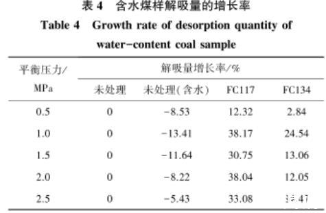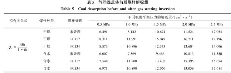 通過對干燥煤樣解吸量和解吸速率的分析,經過氣潤濕反轉劑FC117和FC134處理后的煤樣解吸量和解吸速率均有所提升。定量地分析了氣潤濕反轉劑通過物理吸附的方式吸附在煤體表面,降低煤體表面自由能,增加煤樣解吸量,為氣潤濕反轉劑提高瓦斯抽采效果提供理論依據。