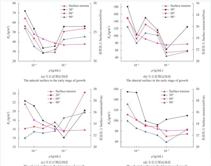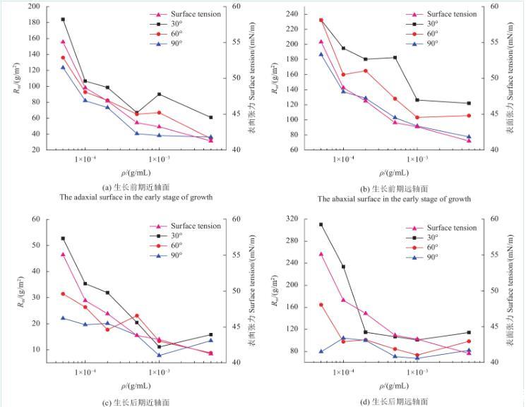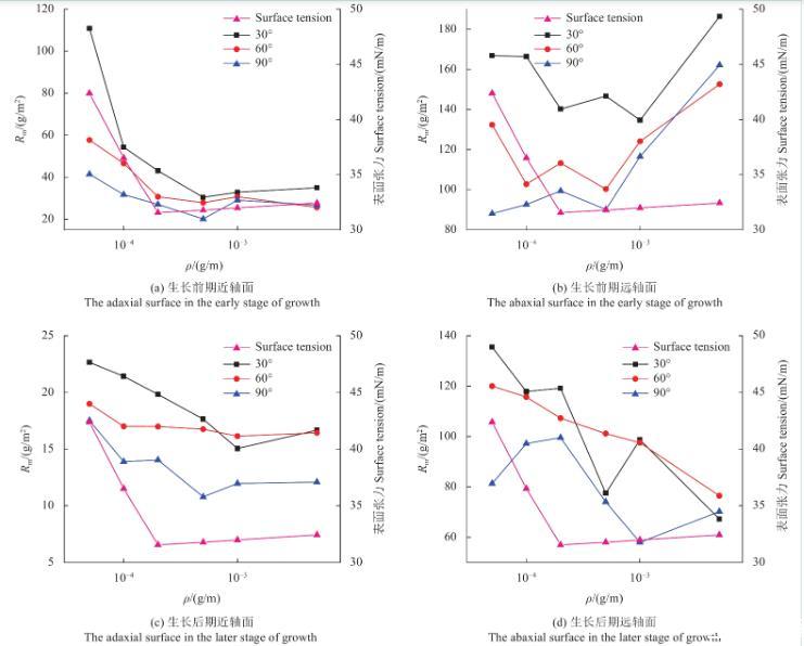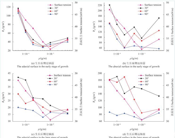 圖6為不同濃度SilwetL-77溶液在蘋果葉片近、遠軸面的Rm變化規律。由圖可知,當溶液質量濃度低于cmc時,蘋果葉片生長前、后期遠軸面的Rm值和表面張力均隨溶液質量濃度的降低而減小。此外,蘋果葉片生長后期近軸面只有在30°傾角時的Rm值與表面張力隨溶液質量濃度的提高而減小,60°傾角和90°傾角時Rm值隨溶液濃度變化不大。蘋果葉片生長后期遠軸面Rm值和表面張力隨溶液濃度的變化與生長前期基本一致。