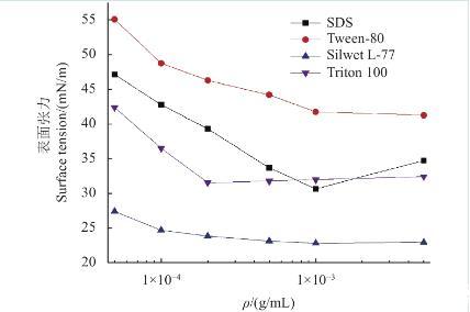 圖2 4種供試表面活性劑表面張力隨其質量濃度變化的趨勢