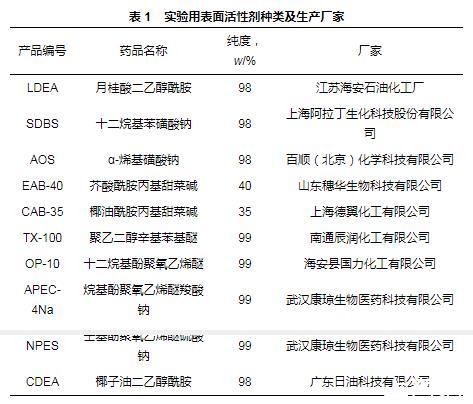 表1實驗用表面活性劑種類及生產廠家