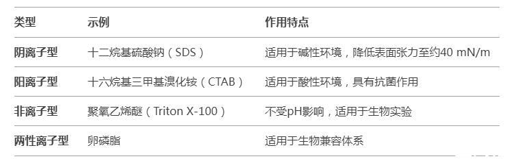 陰離子型十二烷基硫酸鈉(SDS)適用于堿性環境,降低表面張力至約40 mN/m