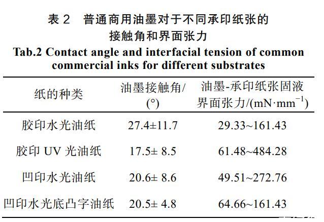 表2普通商用油墨對(duì)于不同承印紙張的接觸角和界面張力