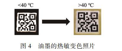 進(jìn)一步探索通用油墨功能化的可能性。在通用油墨的配方中引入熱敏黑材料,以檢驗(yàn)其熱變色防偽性能。如圖4所示,二維碼的黑色邊框采用熱敏黑復(fù)合通用油墨。當(dāng)溫度>40℃時(shí),中間的普通商用油墨顏色保持不變,而熱敏黑復(fù)合通用油墨邊框則逐漸變?yōu)榈S色。