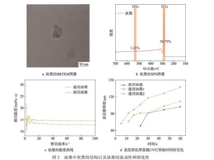 在制備油墨時(shí),需關(guān)注黏度、分散穩(wěn)定性和固化速度,確保噴碼順利。炭黑是關(guān)鍵組分,為避免炭黑團(tuán)聚導(dǎo)致穩(wěn)定性下降和打印堵塞,選擇粒徑適中的炭黑。粒徑過(guò)小易團(tuán)聚,過(guò)大可能堵塞,所選炭黑粒徑在50 nm左右,HRTEM圖像如圖2a所示。對(duì)所選炭黑進(jìn)行XPS分析,發(fā)現(xiàn)其氧含量高達(dá)1.2%,如圖2b所示。這一特性有望改善炭黑與油墨中極性液體的相互作用,從而進(jìn)一步提升油墨的穩(wěn)定性。炭黑的良好分散性不僅有助于提高油墨的穩(wěn)定性,還有助于降低油墨的黏度。如圖2c所示,通用油墨的黏度降至13.0 mPa·s,相比商用油墨的15.5 mPa·s下降約17%,黏度的降低更有利于噴墨打印的流暢進(jìn)行。