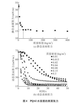 因此,本文采用芬蘭Kibron公司的表面張力儀在20一22℃下研究了溶液的界面性質,如靜態和動態表面張力。不同PQAI溶液的靜態表面張力的變化如圖4(a)所示。可以看出,在去離子水中加人少量表面活性劑,溶液的表面張力急劇下降。然而,在質量濃度>0.04kg/m2時,下降趨勢開始緩慢。這意味著PQAI水溶液的pcMc~0.04kg/m2,此時表面活性劑水溶液靜態表面張力為16.07mN/m。