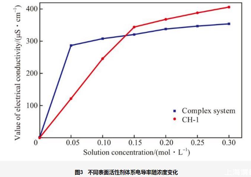 由圖3可看出,兩種表面活性劑的電導率均隨濃度的增加呈先迅速增大后緩慢增長的趨勢。這是因為表面活性劑濃度低于cmc時,表面活性劑主要以單體形式存在,單體中的離子可在溶液中自由移動,從而增加了溶液的導電能力;當表面活性劑濃度高于cmc時,一部分離子被包裹在膠束內部,使得自由移動的離子數量增加幅度減小,遠小于濃度低于cmc時電導率隨濃度增加的幅度。陽-非離子復合表面活性劑電導率轉折點時的濃度低于CH-1電導率轉折點時的濃度。這是因為復配后,離子型表面活性劑的離子頭基與非離子表面活性劑的極性頭基之間可通過靜電引力、離子-偶極等作用相結合。這種相互作用增強了表面活性劑分子在界面上的吸附能力和在溶液中的聚集能力,使得形成膠束所需的濃度降低,即cmc減小。