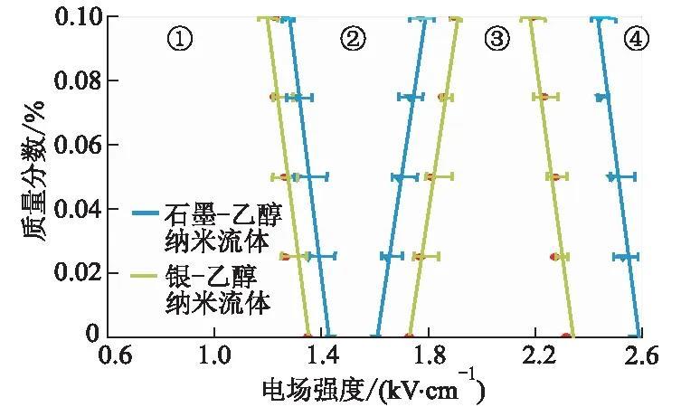 加入納米顆粒后τc/τH的變化如表1所示。納米顆粒的加入使得τc/τH逐漸升高并更接近于1,這表明納米顆粒的加入讓流體表面毛細(xì)波受到表面電荷遷移的阻尼逐漸升高,加速了流體由滴狀模式向紡錘模式的轉(zhuǎn)變,使得模式轉(zhuǎn)變所需臨界電場強(qiáng)度逐漸降低。在質(zhì)量分?jǐn)?shù)相同時,石墨~乙醇納米流體的τc/τH始終小于銀~乙醇納米流體的τc/τH,因此,由滴狀模式進(jìn)入紡錘模式時石墨~乙醇納米流體所需電場強(qiáng)度更高(圖2區(qū)間①→②)。