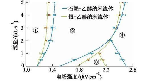 流量是影響納米流體霧化特性的另一重要參數(shù)。尋找在較大流量下依然能保持穩(wěn)定霧化效果的區(qū)間,對工業(yè)應(yīng)用具有十分重要的意義。質(zhì)量分?jǐn)?shù)為0.1%的納米流體在不同流量下霧化模式隨電壓的變化區(qū)間如圖3所示,區(qū)間①為滴狀模式,區(qū)間②為紡錘模式,區(qū)間③為錐射流模式,區(qū)間④為多股射流模式。相同電場強(qiáng)度下隨著流量的增加,單位體積流體荷電量也隨之減小。因此,流體從滴狀模式進(jìn)入紡錘模式所需電場強(qiáng)度逐漸升高(圖3區(qū)間①→②)。由圖3區(qū)間②可知,隨著流量的增大紡錘模式所占區(qū)間逐漸增大。低流速(<2μL·s-1)狀態(tài)下,電場強(qiáng)度增大,流體表面集聚大量電荷,致使液體表面張力降低,霧化模式也就從紡錘模式逐步向錐射流模式過渡(圖3區(qū)間②→③)。納米流體的錐射流模式僅僅發(fā)生在流量低于2μL·s-1時,并且隨著流量的增大,錐射流模式所在區(qū)間迅速減小直至消失(圖3區(qū)間③)。電場對流體荷電的能力有限,流量的增加使得流體不穩(wěn)定性增大,大部分電荷無法聚集至液錐表面,從而導(dǎo)致錐射流模式隨著流量的增大,其霧化區(qū)間迅速消失。