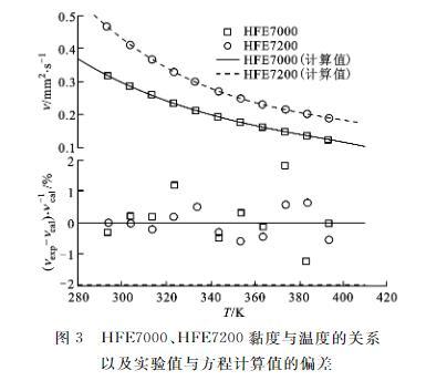 圖3給出了HFE7000、HFE7200黏度與溫度的關系以及實驗值與擬合方程計算值的偏差,結果表明,實驗值與方程計算值的偏差均在±2%之內(nèi)。
