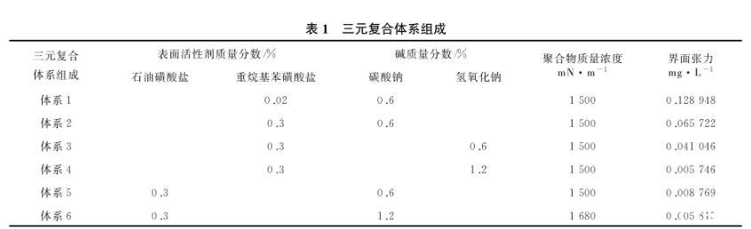 (4)實驗用三元復合體系的組成見表1,界面張力分布在3個數量級。