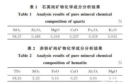 由表1可知,石英純礦物樣品中SiO2含量為98.37%,樣品中含有少量Al、Mg及其他微量元素,因此石英樣品可視為純礦物,滿足試驗要求。由表2可知,赤鐵礦中TFe含量為68.24%,樣品中含有少量Si及其他微量元素,雜質含量較少,因而赤鐵礦樣品可視為純礦物。