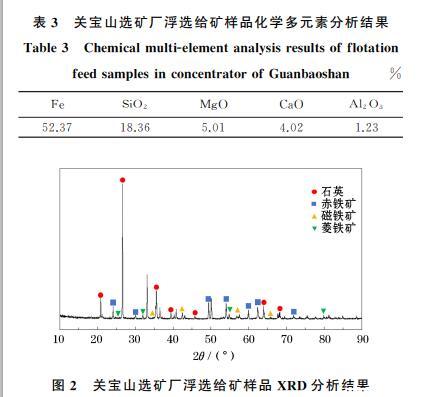 試驗所用礦石為關寶山鐵礦,具有礦物組成復雜、嵌布粒度細、分選難度大等特點。關寶山選礦廠浮選給礦樣品經自然陰干后進行混勻縮分取樣,其化學多元素分析結果見表3.由表3可知,浮選給礦中Fe含量為52.37%,脈石礦物以含硅礦物為主,SiO2含量為18.36%;其次為含鈣及含鎂礦物,MgO、CaO含量分別為5.01%、4.02%.關寶山選礦廠浮選給礦樣品XRD分析結果如圖2所示。由