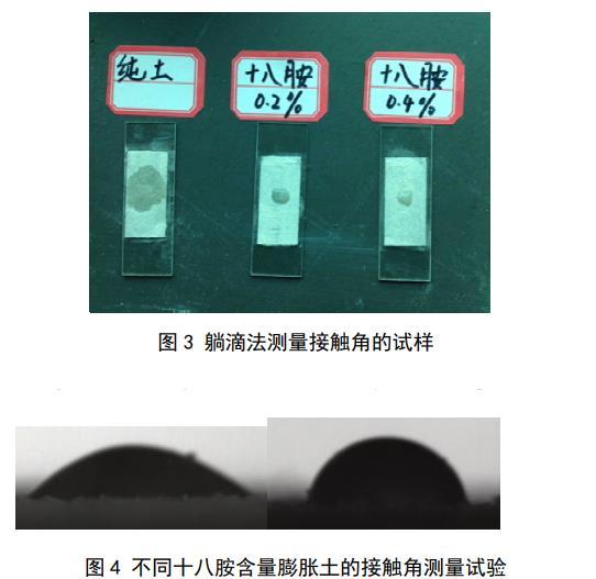 目前測量粉體接觸角(包括土顆粒)的方法主要有3種:躺滴法、毛細管上升法和Wilhelmy平板法,其中,躺滴法測出的接觸角為介于前進接觸角和后退接觸角之間的表觀接觸角,毛細管上升法測出的接觸角為前進接觸角,Wilhelmy平板法測出的接觸角為前進接觸角或后退接觸角。土體開裂是一個相對較慢的過程,因此土顆粒與孔隙水的接觸角大部分時間應該處于前進接觸和后退接觸角之間的某一表觀接觸角。所以,本文采用躺滴法對土顆粒接觸角進行測量。土樣烘干后過0.075 mm的篩,取長度為4 cm左右的雙面膠帶貼到載玻片上,將篩好的土顆粒均勻覆蓋載玻片,并用重量為200 g的砝碼壓住載玻片,持續時間為2 min,移開砝碼后反復輕輕磕碰載玻片以去除多余的土顆粒,直到膠帶表面覆蓋有一層薄薄的土顆粒,且土顆粒分布均勻無明顯凸起。如圖3所示,當水滴滴到被純土覆蓋的膠帶上時,液滴迅速擴散開,此時土顆粒的親水性很好,接觸角趨近于0。水滴滴到另外兩個覆蓋著混有十八胺土樣的載玻片時,形成了小液滴,此時固–液界面和氣–液界面之間的夾角不為0,把這2塊載玻片分別放到試驗臺上進行液滴在土顆粒表面的表觀接觸角測量,液滴初始體積為5μL,測量儀器為JC2000型接觸角測量儀,如圖4所示,每個土樣的接觸角反復測量5次后取平均值。十八胺含量為0.2%土樣的接觸角為30.5°,十八胺含量為0.4%土樣的接觸角為60.2°。