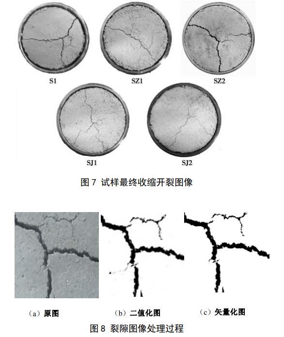 圖7給出了5個試樣在脫濕結束后對應的收縮開裂圖像。從圖中可以看出,每個試樣均出現了不同程度的收縮裂隙,各試樣表面裂隙最終形態具有大致相似的規律:3條裂隙相交于一點,把圓形表面分成了3個部分,S1樣和SZ2樣的裂隙較寬,試樣開裂明顯,其余試樣裂隙發育不明顯,裂隙在形成過程中先形成一條主裂隙,主裂隙發育過程中支裂隙開始發育,最終支裂隙和主裂隙相交形成3條裂隙。S1樣和SZ1樣不僅出現了裂隙,在試樣和鋼環接觸的地方還出現了明顯的分離,試樣出現了體縮,其余試樣也出現了不同程度的體縮,但并不明顯。為得到試樣的裂隙度,先要對采集到的試驗開裂圖片進行圖像處理,如圖8所示,先對采集到的膨脹土干縮過程圖像進行二值化,去除一些非裂隙雜點,再把二值化圖像進行矢量化,矢量化后的圖像通過AUTOCAD提取試樣收縮面積和裂隙面積,最后計算出試樣的收縮開裂裂隙度: