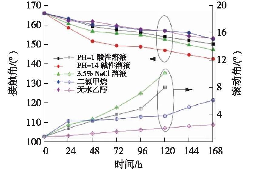 由圖4可知,超疏涂層在無水乙醇和二氯甲烷中浸泡168 h后仍然保持超疏水性能;在pH=1的酸性溶液和質(zhì)量分數(shù)3.5%的NaCl溶液中浸泡120 h后與水仍然保持超疏性能。但在pH=14的堿性溶液中浸泡48 h后接觸角低于150°且已無法滾動。這說明涂層具有較好的耐酸、耐鹽水和耐溶劑性能,但是耐堿性欠佳。