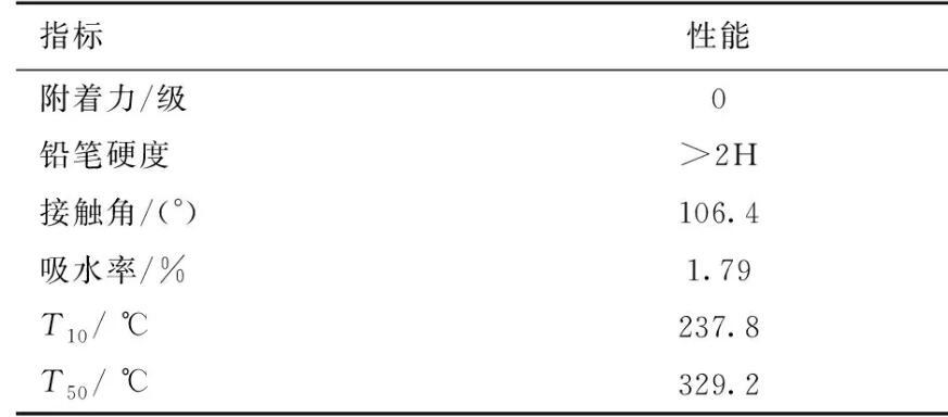 由表1可見,含氟聚氨酯固化膜和玻璃基材之間的附著力達到0級,鉛筆硬度大于2H。FPU薄膜與水的靜態(tài)接觸角為106.4°,遠高于不含氟的聚氨酯膜。本研究的FPU薄膜在浸泡24 h后吸水率趨于平衡,泡水200 h后吸水率不高于1.79%,遠低于一般的聚氨酯的5%吸水率。歸因于C—F鏈段具有很低的表面張力,會自發(fā)地向表面遷移并富集,降低了表面張力,提高了材料的憎水性。除此之外,從表1中還可知FPU的T10和T50分別為237.8和329.2℃。與一般聚氨酯材料相比,F(xiàn)PU的熱穩(wěn)定性沒有很大程度的提升。